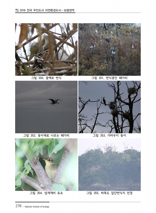2016 전국 무인도서 자연환경조사 보령권역 278 ? National Institute of Ecology 그림 350. 중백로 번식 그림 351. 번식중인 왜가리 그림 352. 둥지재료 나르는 왜가리 그림 353. 가마우지 둥지 그림 354. 섬개개비 유조 그림 355. 하목도 집단번식지전경