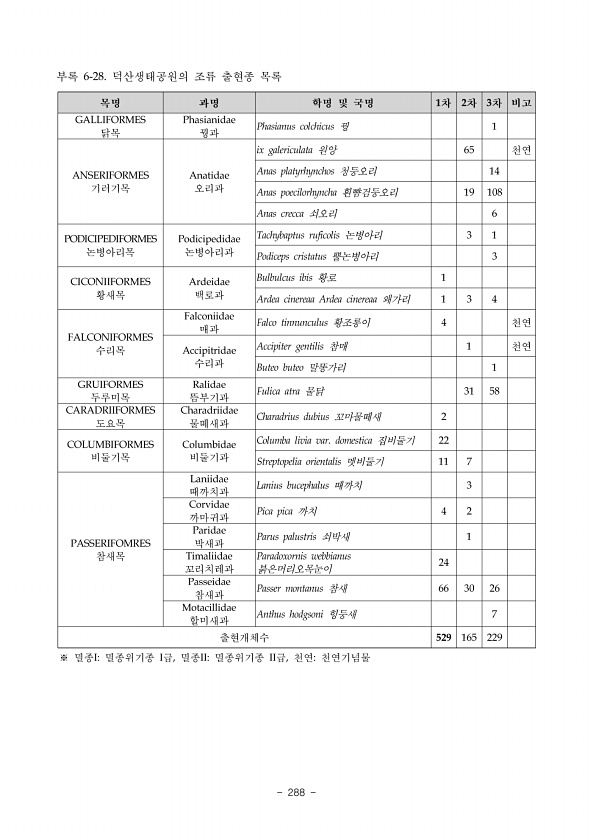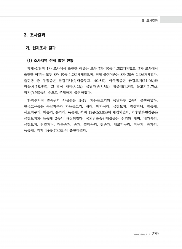 Ⅱ. 조사결과 www.nie.re.kr ? 279 3. 조사결과 가. 현지조사 결과 1 조사지역 전체 출현 현황 댓재-삽당령 1차 조사에서 출현한 어류는 모두 7과 19종 1,202개체였고, 2차 조사에서 출현한 어류는 모두 8과 19종 1,284개체였으며, 전체 출현어종은 8과 20종 2,486개체였다. 출현종 중 우점종은 참갈겨니 상대풍부도, 40.5% , 아우점종은 금강모치 21.0% 와 버들치 18.5% , 그 밖에 새미 8.2% , 묵납자루 3.5% , 참종개 1.8% , 돌고기 1.7% , 꺽지 0.9% 등의 순으로 우세하게 출현하였다. 환경부지정 멸종위기 야생생물 II급인 가는돌고기와 묵납자루 2종이 출현하였다. 한국고유종은 묵납자루와 가는돌고기, 쉬리, 배가사리, 금강모치, 참갈겨니, 참종개,...