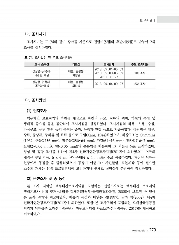 Ⅱ. 조사결과 www.nie.re.kr ? 279 나. 조사시기 조사시기는 표 74와 같이 장마를 기준으로 전반기 5월 와 후반기 9월 로 나누어 2회 조사를 실시하였다. 조사 소구간 대표산 조사일자 주요 조사내용 삽당령-닭목재- 대관령-매봉 매봉, 능경봉, 화랑봉 2018. 05 .0105. 03 2018. 05. 0805. 09 2018. 05. 27 1차 조사 삽당령-닭목재- 대관령-매봉 매봉, 능경봉, 화랑봉 2018. 09. 0409. 07 2차 조사 표 74. 조사일정 및 주요 조사내용 다. 조사방법 1 현지조사 백두대간 보호지역의 하천을 대상으로 하천의 규모, 지류의 위치, 하천의 특성 및 생태적 중요성 등을 감안하여 조사지점을 선정하였다. 조사지점의 하폭, 유폭, 수심, 하상구조, 주변 환경 ...