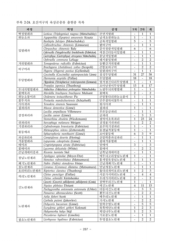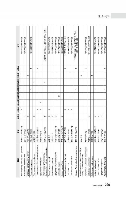 www ·nie·re·kr ? 279 학명 국명 도창리 성재산 대성산 적근산 산양리 주파리 고둔골 비운이 비고 Xestia Megasema ditrapezium 민들레거세미밤나방 1 1 적색목록 미평가 NE Notodonta dembowskii 밑노랑재주나방 2 적색목록 미평가 NE Orthops Orthops udonis 바른장님노린재 1 1 Fentonia ocypete 밤나무재주나방 1 1 적색목록 미평가 NE Coptosoma scutellatum 방패알노린재 1 1 Gonioctena Gonioctena sibirica 배검은수염잎벌레 1 1 Eysarcoris ventralis 배둥글노린재 1 1 Rhynocoris Rhynocoris leucospilus subsp. leucospilus 배홍무...