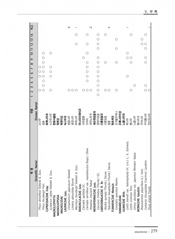 www.nie.re.kr ? 279 학 명 Scientific Name 국명 Korean Name 1 2 3 4 5 6 7 8 9 10 11 12 13 14 비고 Pinus densiflora Siebold & Zucc. 소나무 ○ ○ ○ ○ Pinus thunbergii Parl. 곰솔 ○ ○ ○ ○ ○ ○ ○ ○ ○ CUPRESSACEAE Gray 측백나무과 Juniperus rigida Siebold & Zucc. 노간주나무 ○ ○ ○ ○ ○ MAGNOLIOPHYTA 현화식물문 MAGNOLIOPSIDA 목련강 MAGNOLIIDAE 목련아강 LAURACEAE Juss. 녹나무과 Cinnamomum japonicum Siebold 생달나무 ○ Ⅲ Lindera obtusiloba Blume 생강나무 ○ M...
