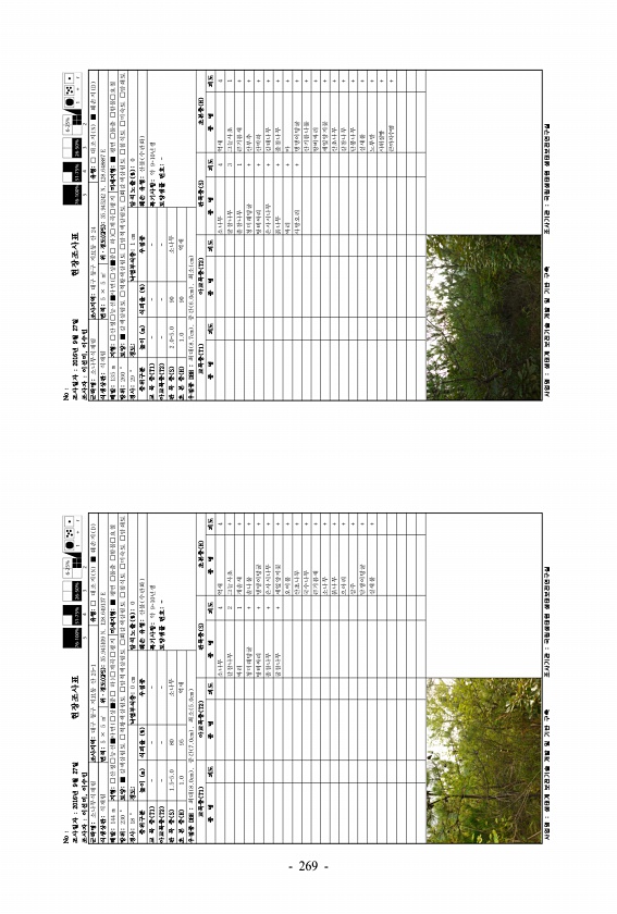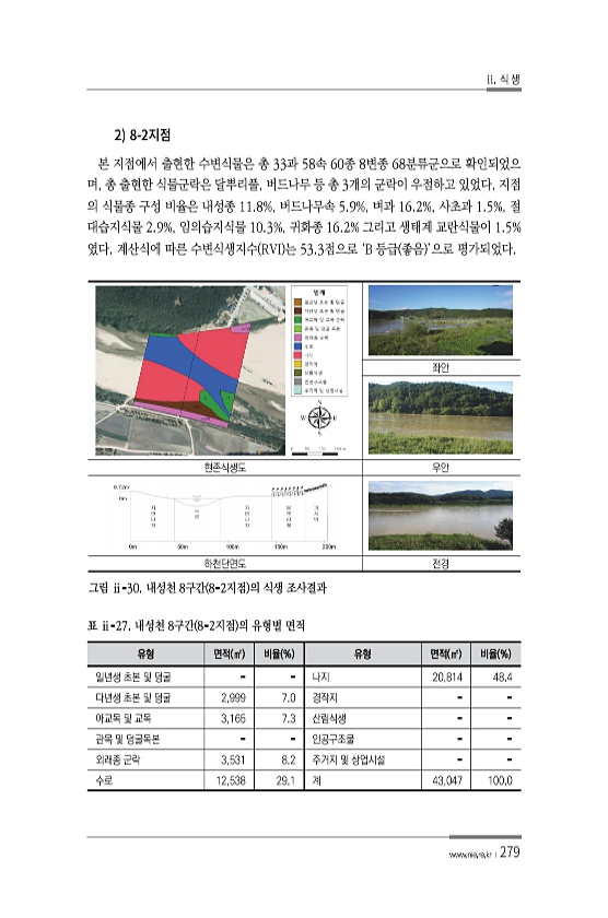 ii. 식 생 www.nie.re.kr ?279 2 8- 본 지점에서 출현한 수변식물은 총 33과 58속 60종 8변종 68분류군으로 확인되었으 며, 총 출현한 식물군락은 달뿌리풀, 버드나무 등 총 3개의 군락이 우점하고 있었다. 지점 의 식물종 구성 비율은 내성종 11.8%, 버드나무속 5.9%, 벼과 16.2%, 사초과 1.5%, 절 대습지식물 2.9%, 임의습지식물 10.3%, 귀화종 16.2% 그리고 생태계 교란식물이 1.5% 였다. 계산식에 따른 수변식생지수 RVI 는 53.3점으로 ‘B 등급 좋음 ’으로 평가되었다. 좌안 현존식생도 우안 하천단면도 전경 그림 ⅱ-30. 내성천 8구간 8-2지점 의 식생 조사결과 유형 면적 ㎡ 비율 % 유형 면적 ㎡ 비율 % 일년생 초본 및 덩굴 나지 20,814 ...