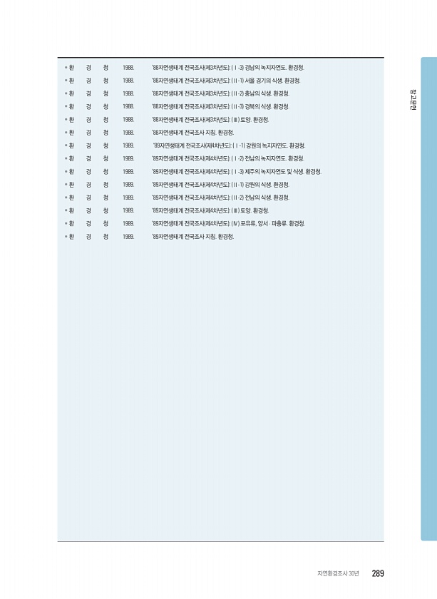 ? 환 경 청 1988. ‘88자연생태계 전국조사 제3차년도 Ⅰ-3 경남의 녹지자연도. 환경청. ? 환 경 청 1988. ‘88자연생태계 전국조사 제3차년도 Ⅱ-1 서울 경기의 식생. 환경청. ? 환 경 청 1988. ‘88자연생태계 전국조사 제3차년도 Ⅱ-2 충남의 식생. 환경청. ? 환 경 청 1988. ‘88자연생태계 전국조사 제3차년도 Ⅱ-3 경북의 식생. 환경청. ? 환 경 청 1988. ‘88자연생태계 전국조사 제3차년도 Ⅲ 토양. 환경청. ? 환 경 청 1988. ‘88자연생태계 전국조사 지침. 환경청. ? 환 경 청 1989. ‘89자연생태계 전국조사 제4차년도 Ⅰ-1 강원의 녹지자연도. 환경청. ? 환 경 청 1989. ‘89자연생태계 전국조사 제4차년도 Ⅰ-2 전남의 녹지자연도. 환경청. ...