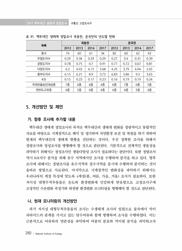 2017 백두대간 생태계 정밀조사 구룡산 고정조사구 280 ? National Institute of Ecology 표 91. 백두대간 생태계 정밀조사 옥동천, 운곡천의 년도별 변화 목록 옥동천 운곡천 2012 2013 2014 2017 2012 2013 2014 2017 종수 74 60 61 34 82 60 62 42 우점도지수 0.29 0.34 0.29 0.29 0.27 0.4 0.31 0.39 균등도지수 0.78 0.75 0.7 0.91 0.77 0.72 0.67 0.81 다양도지수 4.2 4.02 4.15 2.68 4.25 3.79 4.04 2.45 풍부도지수 6.15 6.21 8.9 3.72 6.83 5.84 9.2 3.65 KSI 0.15 0.23 0.17 0.23 0.16 0.19 0.19 0....