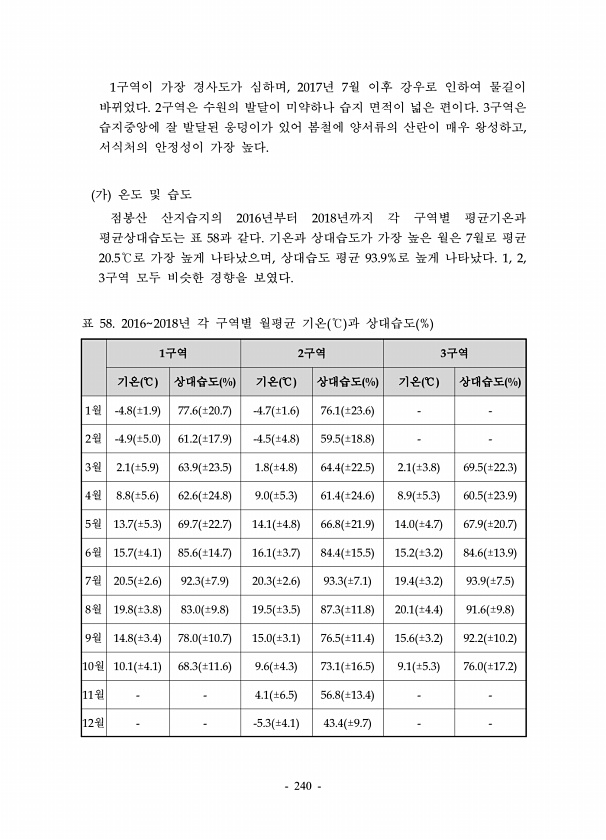 240 1구역이 가장 경사도가 심하며, 2017년 7월 이후 강우로 인하여 물길이 바뀌었다. 2구역은 수원의 발달이 미약하나 습지 면적이 넓은 편이다. 3구역은 습지중앙에 잘 발달된 웅덩이가 있어 봄철에 양서류의 산란이 매우 왕성하고, 서식처의 안정성이 가장 높다. 가 온도 및 습도 점봉산 산지습지의 2016년부터 2018년까지 각 구역별 평균기온과 평균상대습도는 표 58과 같다. 기온과 상대습도가 가장 높은 월은 7월로 평균 20.5℃로 가장 높게 나타났으며, 상대습도 평균 93.9%로 높게 나타났다. 1, 2, 3구역 모두 비슷한 경향을 보였다. 1구역 2구역 3구역 기온 ℃ 상대습도 % 기온 ℃ 상대습도 % 기온 ℃ 상대습도 % 1월 -4.8 ±1.9 77.6 ±20.7 -4.7 ±1.6 76.1 ±2...