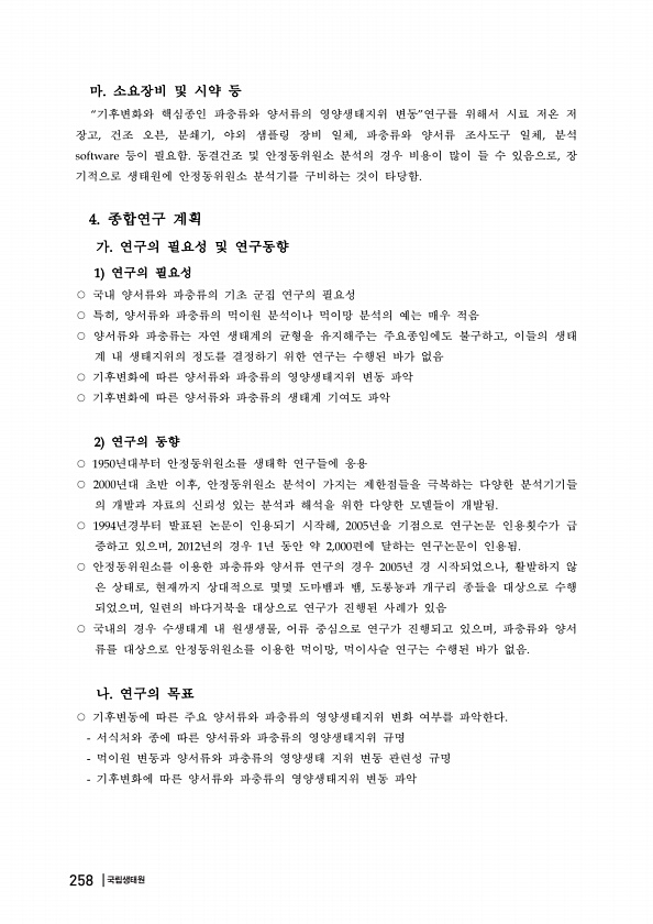 마 소요장비 및 시약 등 기후변화와 핵심종인 파충류와 양서류의 영양생태지위 변동 연구를 위해서 시료 저온 저 장고 건조 오븐 분쇄기 야외 샘플링 장비 일체 파충류와 양서류 조사도구 일체 분석 등이 필요함 동결건조 및 안정동위원소 분석의 경우 비용이 많이 들 수 있음으로 장 기적으로 생태원에 안정동위원소 분석기를 구비하는 것이 타당함 종합연구 계획 가 연구의 필요성 및 연구동향 연구의 필요성 국내 양서류와 파충류의 기초 군집 연구의 필요성 특히 양서류와 파충류의 먹이원 분석이나 먹이망 분석의 예는 매우 적음 양서류와 파충류는 자연 생태계의 균형을 유지해주는 주요종임에도 불구하고 이들의 생태 계 내 생태지위의 정도를 결정하기 위한 연구는 수행된 바가 없음 기후변화에 따른 양서류와 파충류의 영양생태지위 변동 파악...