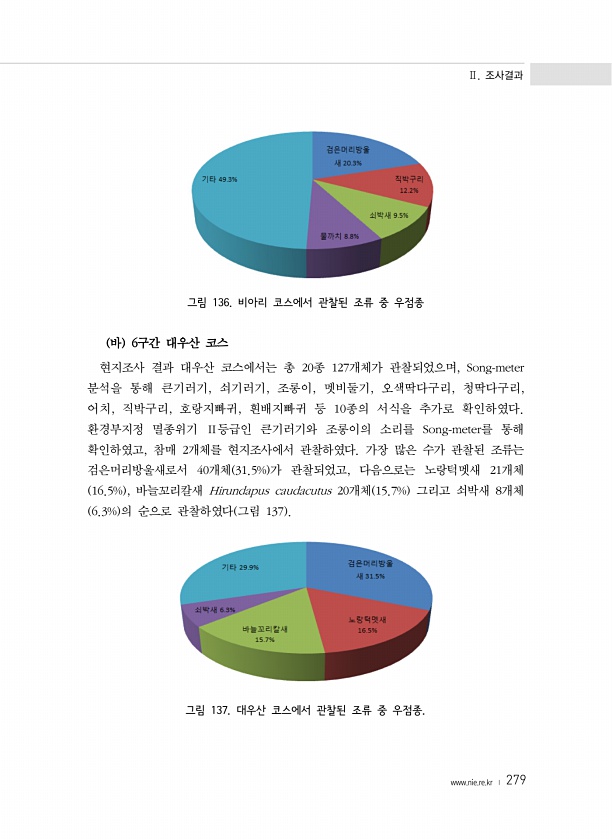 Ⅱ. 조사결과 www.nie.re.kr ? 279 그림 136. 비아리 코스에서 관찰된 조류 중 우점종 바 6구간 대우산 코스 현지조사 결과 대우산 코스에서는 총 20종 127개체가 관찰되었으며, Song-meter 분석을 통해 큰기러기, 쇠기러기, 조롱이, 멧비둘기, 오색딱다구리, 청딱다구리, 어치, 직박구리, 호랑지빠귀, 흰배지빠귀 등 10종의 서식을 추가로 확인하였다. 환경부지정 멸종위기 Ⅱ등급인 큰기러기와 조롱이의 소리를 Song-meter를 통해 확인하였고, 참매 2개체를 현지조사에서 관찰하였다. 가장 많은 수가 관찰된 조류는 검은머리방울새로서 40개체 31.5% 가 관찰되었고, 다음으로는 노랑턱멧새 21개체 16.5% , 바늘꼬리칼새 Hirundapus caudacutus 20개체 15.7% 그리...