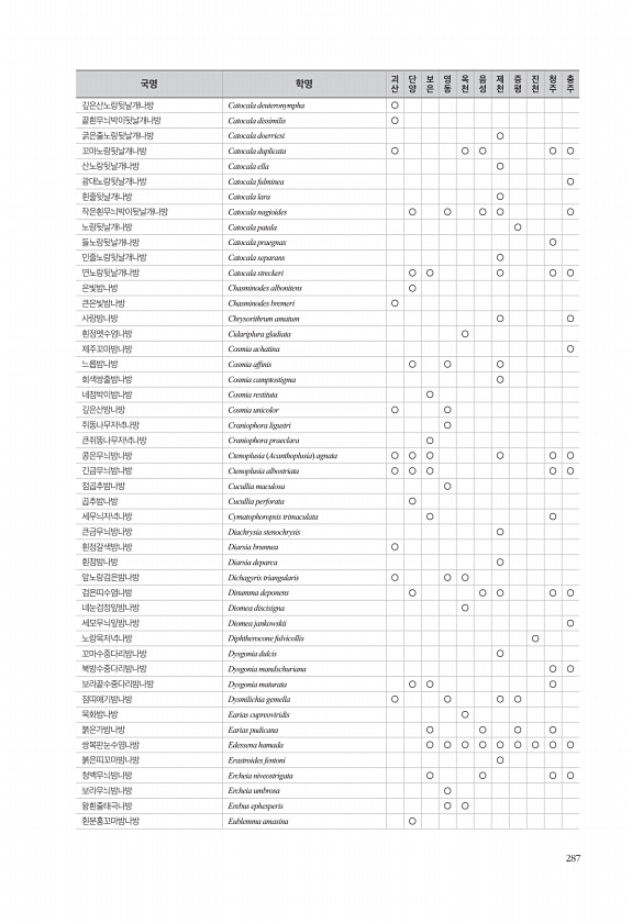 287 깊은산노랑뒷날개나방 Catocala deuteronympha ○ 끝흰무늬박이뒷날개나방 Catocala dissimilis ○ 굵은줄노랑뒷날개나방 Catocala doerriesi ○ 꼬마노랑뒷날개나방 Catocala duplicata ○ ○ ○ ○ ○ 산노랑뒷날개나방 Catocala ella ○ 광대노랑뒷날개나방 Catocala fulminea ○ 흰줄뒷날개나방 Catocala lara ○ 작은흰무늬박이뒷날개나방 Catocala nagioides ○ ○ ○ ○ ○ 노랑뒷날개나방 Catocala patala ○ 들노랑뒷날개나방 Catocala praegnax ○ 민줄노랑뒷날개나방 Catocala separans ○ 연노랑뒷날개나방 Catocala streckeri ○ ○ ○ ○ ○ 은빛밤나방 Chasm...
