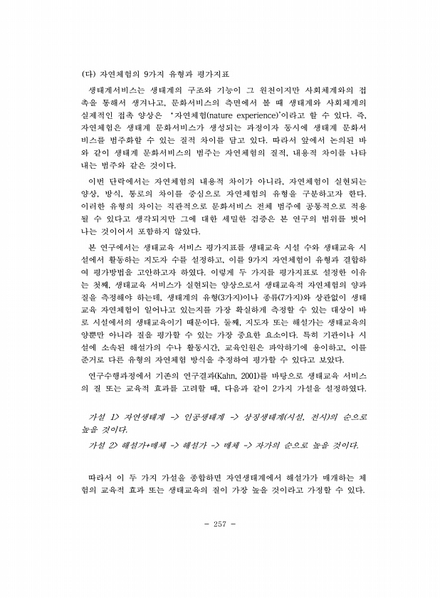 257 다 자연체험의 9가지 유형과 평가지표 생태계서비스는 생태계의 구조와 기능이 그 원천이지만 사회체계와의 접 촉을 통해서 생겨나고, 문화서비스의 측면에서 볼 때 생태계와 사회체계의 실제적인 접촉 양상은 ‘자연체험 nature experience 이라고 할 수 있다. 즉, 자연체험은 생태계 문화서비스가 생성되는 과정이자 동시에 생태계 문화서 비스를 범주화할 수 있는 질적 차이를 담고 있다. 따라서 앞에서 논의된 바 와 같이 생태계 문화서비스의 범주는 자연체험의 질적, 내용적 차이를 나타 내는 범주와 같은 것이다. 이번 단락에서는 자연체험의 내용적 차이가 아니라, 자연체험이 실현되는 양상, 방식, 통로의 차이를 중심으로 자연체험의 유형을 구분하고자 한다. 이러한 유형의 차이는 직관적으로 문화서비스 전체 범주...