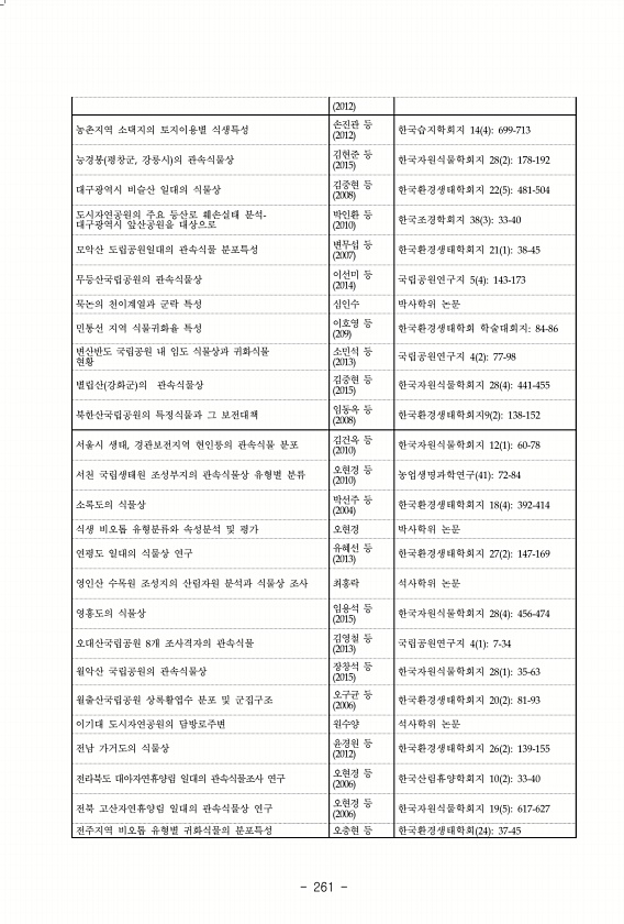 261 2012 농촌지역 소택지의 토지이용별 식생특성 손진관 등 2012 한국습지학회지 14 4 699-713 능경봉 평창군, 강릉시 의 관속식물상 김현준 2015 등 한국자원식물학회지 28 2 178-192 대구광역시 비슬산 일대의 식물상 김중현 등 2008 한국환경생태학회지 22 5 481-504 도시자연공원의 주요 등산로 훼손실태 분석- 대구광역시 앞산공원을 대상으로 박인환 등 2010 한국조경학회지 38 3 33-40 모악산 도립공원일대의 관속식물 분포특성 변무섭 등 2007 한국환경생태학회지 21 1 38-45 무등산국립공원의 관속식물상 이선미 등 2014 국립공원연구지 5 4 143-173 묵논의 천이계열과 군락 특성 심인수 박사학위 논문 민통선 지역 식물귀화율 특성 이호영 등 209 한국환경생태...