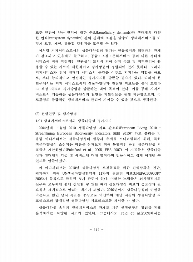 619 또한 인간이 얻는 편익에 대한 수요 beneficiary demands 와 생태계의 다양 한 변화 ecosystem dynamics 간의 관계에 초점을 맞추어 생태계서비스를 어 떻게 보전, 제공, 창출할 것인지를 모색할 수 있다. 이처럼 지지서비스로서의 생물다양성의 평가는 인류복지와 혜택과의 관계 가 강조되고 있음에도 불구하고, 공급·조절·문화서비스 등의 다른 생태계 서비스에 비해 직접적인 연관성이 도외시 되어 실제 국토 및 지역관리에 활 용할 수 있는 자료가 제한적이고 평가방법이 정립되어 있지 못하다. 그러나 지지서비스가 전체 생태계 서비스의 근간을 이루고 지지하는 역할을 하므 로, 보다 합리적이고 실질적인 평가지표를 발굴할 필요가 있다. 따라서 본 연구에서는 지지 서비스로서의 생물다양성과 관련된 ...