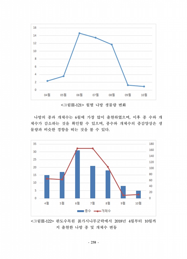 258 그림Ⅲ-121 월별 나방 생물량 변화 나방의 종과 개체수는 6월에 가장 많이 출현하였으며, 이후 종 수와 개 체수가 감소하는 것을 확인할 수 있으며, 종수와 개체수의 증감양상은 생 물량과 비슷한 경향을 띠는 것을 볼 수 있다. 그림Ⅲ-122 완도수목원 붉가시나무군락에서 2018년 4월부터 10월까 지 출현한 나방 종 및 개체수변동