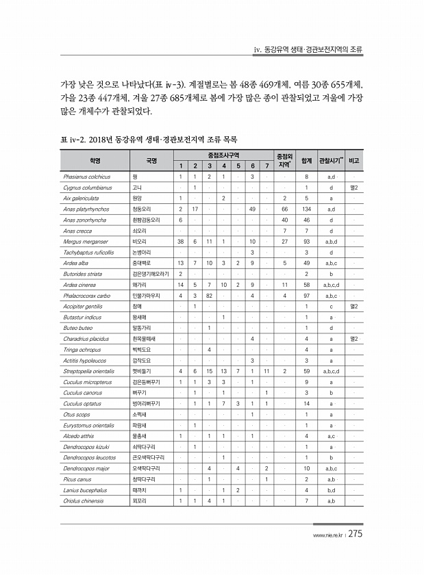iv. 동강유역 생태·경관보전지역의 조류 www.nie.re.kr ?275 가장 낮은 것으로 나타났다 표 ⅳ-3 계절별로는 봄 48종 469개체, 여름 30종 655개체, 가을 23종 447개체, 겨울 27종 685개체로 봄에 가장 많은 종이 관찰되었고 겨울에 가장 많은 개체수가 관찰되었다. 학명 국명 중점조사구역 중점외 1 2 3 4 5 6 7 지역* 합계 관찰시기** 비고 Phasianus colchicus 꿩 1 1 2 1 3 8 a,d Cygnus columbianus 고니 1 1 d 멸2 Aix galericulata 원앙 1 2 2 5 a Anas platyrhynchos 청둥오리 2 17 49 66 134 a,d Anas zono...