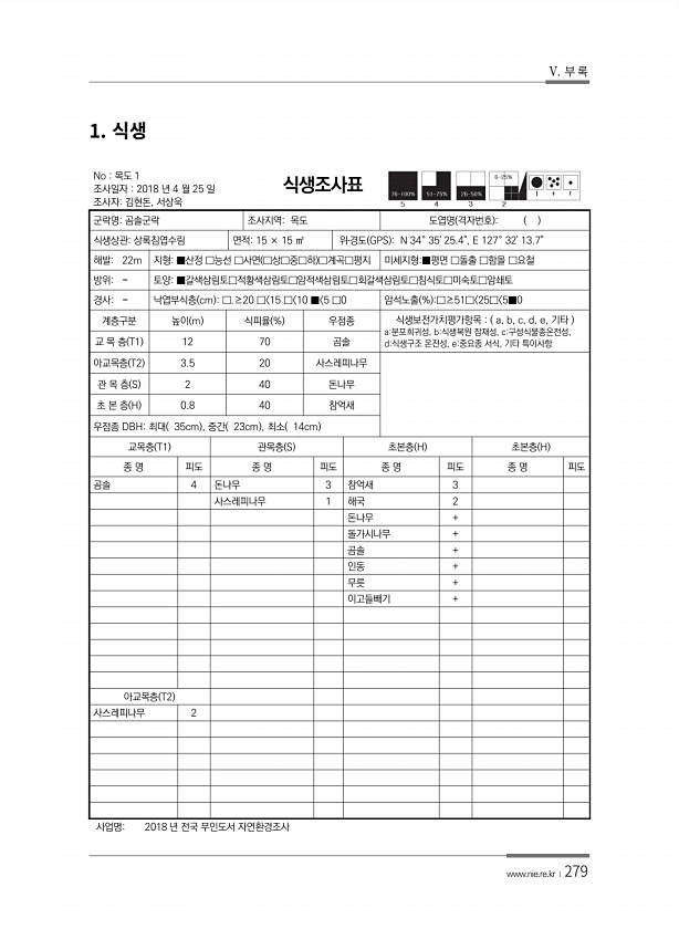 V. 부 록 www.nie.re.kr ?279 1. No 목도 1 조사일자 2018 년 4 월 25 일 조사자김현돈, 서상욱 식생조사표 군락명곰솔군락 조사지역목도 도엽명 격자번호 식생상관상록침엽수림 면적15 × 15 ㎡ 위?경도 GPS N 34° 3525.4, E 127° 3213.7해발22m 지형■산정 □능선 □사면 □상□중□하 □계곡□평지 미세지형■평면 □돌출 □함몰 □요철 방위토양■갈색삼림토□적황색삼림토□암적색삼림토□회갈색삼림토□침식토□미숙토□암쇄토 경사낙엽부식층 cm □.≥20 □ 15 □ 10 ■ 5 □0 암석노출 % □≥51□ 25□ 5■0 계층구분 높이 m 식피율 % 우점종 식생보전가치평가항목 a, b, c, d, e, 기타 a분포희귀성, b식생복원 잠재성, c구성식물종온전성, 교 목 층 T1 ...