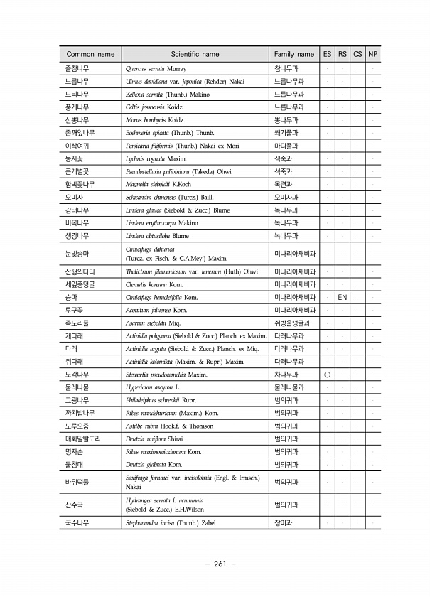 261 Common name Scientific name Family name ES RS CS NP 졸참나무 Quercus serrata Murray 참나무과 느릅나무 Ulmus davidiana var. japonica Rehder Nakai 느릅나무과 느티나무 Zelkova serrata Thunb. Makino 느릅나무과 풍게나무 Celtis jessoensis Koidz. 느릅나무과 산뽕나무 Morus bombycis Koidz. 뽕나무과 좀깨잎나무 Boehmeria spicata Thunb. Thunb. 쐐기풀과 이삭여뀌 Persicaria filiformis Thunb. Nakai ex Mori 마디풀과 동자꽃 Lychnis cognata Maxim. 석죽과 큰개별꽃 Pseudostellaria ...