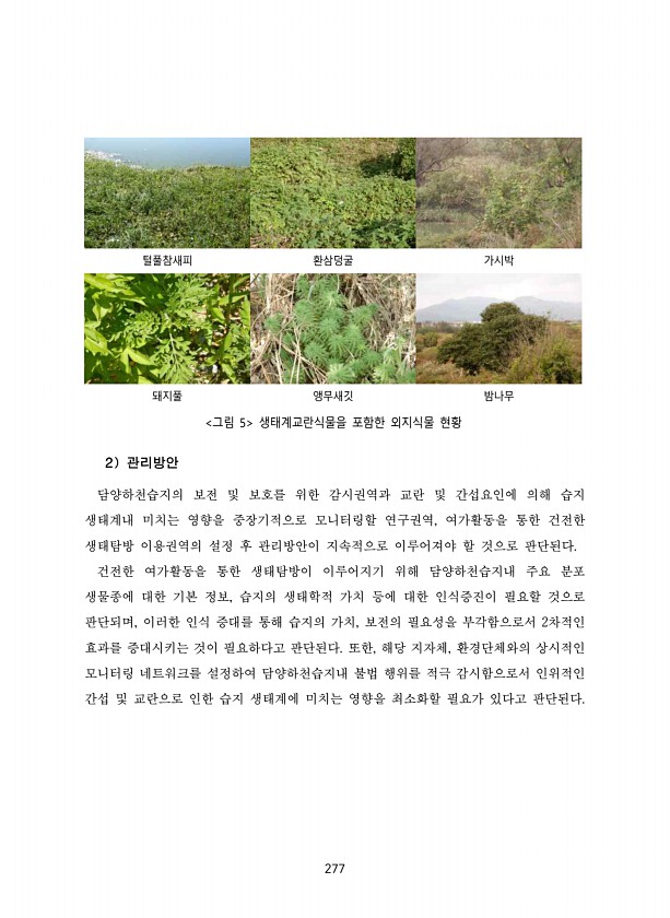 277 털풀참새피 환삼덩굴 가시박 돼지풀 앵무새깃 밤나무 그림 5 생태계교란식물을 포함한 외지식물 현황 2 관리방안 담양하천습지의 보전 및 보호를 위한 감시권역과 교란 및 간섭요인에 의해 습지 생태계내 미치는 영향을 중장기적으로 모니터링할 연구권역, 여가활동을 통한 건전한 생태탐방 이용권역의 설정 후 관리방안이 지속적으로 이루어져야 할 것으로 판단된다. 건전한 여가활동을 통한 생태탐방이 이루어지기 위해 담양하천습지내 주요 분포 생물종에 대한 기본 정보, 습지의 생태학적 가치 등에 대한 인식증진이 필요할 것으로 판단되며, 이러한 인식 증대를 통해 습지의 가치, 보전의 필요성을 부각함으로서 2차적인 효과를 증대시키는 것이 필요하다고 판단된다. 또한, 해당 지자체, 환경단체와의 상시적인 모니터링 네트워크를 설정하...