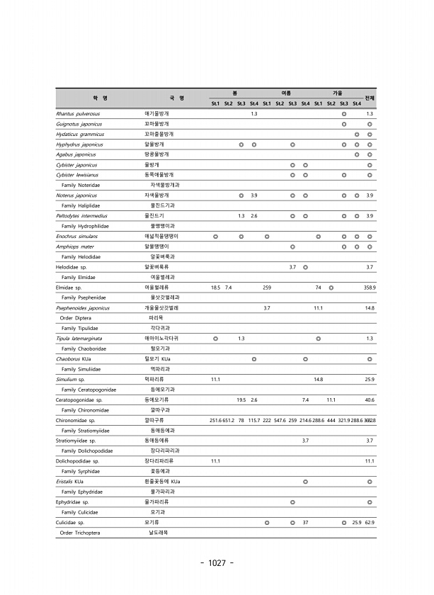 1027 학 명 국 명 봄 여름 가을 전체 St.1 St.2 St.3 St.4 St.1 St.2 St.3 St.4 St.1 St.2 St.3 St.4 Rhantus pulverosus 애기물방개 1.3 ◎ 1.3 Guignotus japonicus 꼬마물방개 ◎ ◎ Hydaticus grammicus 꼬마줄물방개 ◎ ◎ Hyphydrus japonicus 알물방개 ◎ ◎ ◎ ◎ ◎ ◎ Agabus japonicus 땅콩물방개 ◎ ◎ Cybister japonicus 물방개 ◎ ◎ ◎ Cybister lewisianus 동쪽애물방개 ◎ ◎ ◎ ◎ Family Noteridae 자색물방개과 Noterus japonicus 자색물방개 ◎ 3.9 ◎ ◎ ◎ ◎ 3.9 Family Haliplidae 물진드기과 Pe...