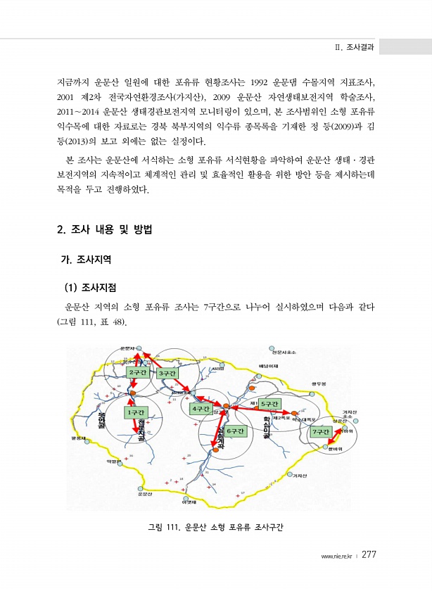 Ⅱ. 조사결과 www.nie.re.kr ? 277 지금까지 운문산 일원에 대한 포유류 현황조사는 1992 운문댐 수몰지역 지표조사, 2001 제2차 전국자연환경조사 가지산 , 2009 운문산 자연생태보전지역 학술조사, 2011∼2014 운문산 생태경관보전지역 모니터링이 있으며, 본 조사범위인 소형 포유류 익수목에 대한 자료로는 경북 북부지역의 익수류 종목록을 기재한 정 등 2009 과 김 등 2013 의 보고 외에는 없는 실정이다. 본 조사는 운문산에 서식하는 소형 포유류 서식현황을 파악하여 운문산 생태·경관 보전지역의 지속적이고 체계적인 관리 및 효율적인 활용을 위한 방안 등을 제시하는데 목적을 두고 진행하였다. 2. 조사 내용 및 방법 가. 조사지역 1 조사지점 운문산 지역의 소형 포유류 조사는 7구간으...