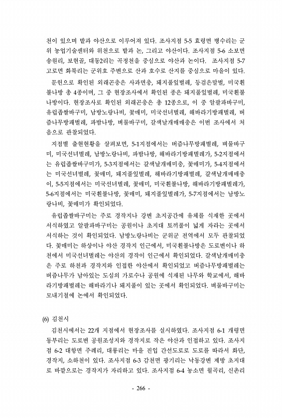 천이 있으며 밭과 야산으로 이루어져 있다. 조사지점 5-5 효령면 병수리는 군 위 농업기술센터와 위천으로 밭과 논, 그리고 야산이다. 조사지점 5-6 소보면 송원리, 보현골, 대동2리는 곡정천을 중심으로 야산과 논이다. 조사지점 5-7 고로면 화북리는 군위호 주변으로 산과 호수로 산지를 중심으로 마을이 있다. 문헌으로 확인된 외래곤충은 사과면충, 돼지풀잎벌레, 등검은말벌, 미국흰 불나방 총 4종이며, 그 중 현장조사에서 확인된 종은 돼지풀잎벌레, 미국흰불 나방이다. 현장조사로 확인된 외래곤충은 총 12종으로, 이 중 알팔파바구미, 유럽좁쌀바구미, 남방노랑나비, 꽃매미, 미국선녀벌레, 해바라기방패벌레, 버 즘나무방패벌레, 파밤나방, 벼물바구미, 갈색날개매매충은 이번 조사에서 처 음으로 관찰되었다. 지점별 출현...