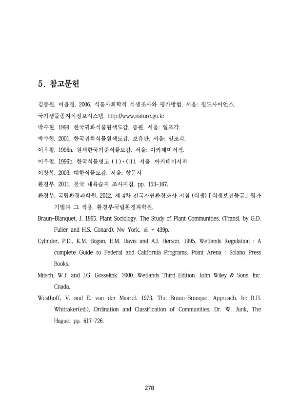 278 5. 참고문헌 김종원, 이율경. 2006. 식물사회학적 식생조사와 평가방법. 서울월드사이언스. 국가생물종지식정보시스템. http//www.nature.go.kr 박수현. 1999. 한국귀화식물원색도감. 증판. 서울일조각. 박수현. 2001. 한국귀화식물원색도감. 보유판. 서울일조각. 이우철. 1996a. 원색한국기준식물도감. 서울아카데미서적. 이우철. 1996b. 한국식물명고 Ⅰ · Ⅱ 서울아카데미서적 이창복. 2003. 대한식물도감. 서울향문사 환경부. 2011. 전국 내륙습지 조사지침. pp. 153-167. 환경부, 국립환경과학원. 2012. 제 4차 전국자연환경조사 지침 식생 「식생보전등급」평가 기법과 그 적용. 환경부?국립환경과학원. Braun-Blanquet. J. 1965. Plant S...