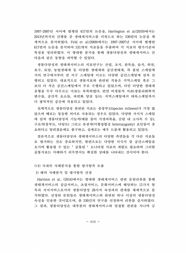 620 19972007년 사이에 발행된 617편의 논문을, Harrington et al. 2010 에서는 2013년까지의 간행물 중 생태계서비스를 키워드로 하는 530편의 논문을 체 계적으로 분석하였다. Feld et al. 2009 에서는 19972007년 사이에 발행된 617편의 논문을 분석하여 531개의 지표들을 추출하여 각 지표의 평가기준과 특징을 정리하였다. 이 방대한 분석을 통해 생물다양성과 생태계서비스 간 다음과 같은 동향을 파악할 수 있었다. 생물다양성과 생태계서비스의 지표연구는 산림, 초지, 관목숲, 습지, 하천, 호수, 토양, 농업생태계 등 다양한 생태계와 공간생태계, 즉 플랏 스케일에 서의 연구에서부터 전 지구 스케일에 이르는 다양한 공간스케일에 걸쳐 진 행되고 있었다. 대표적으로 생물...