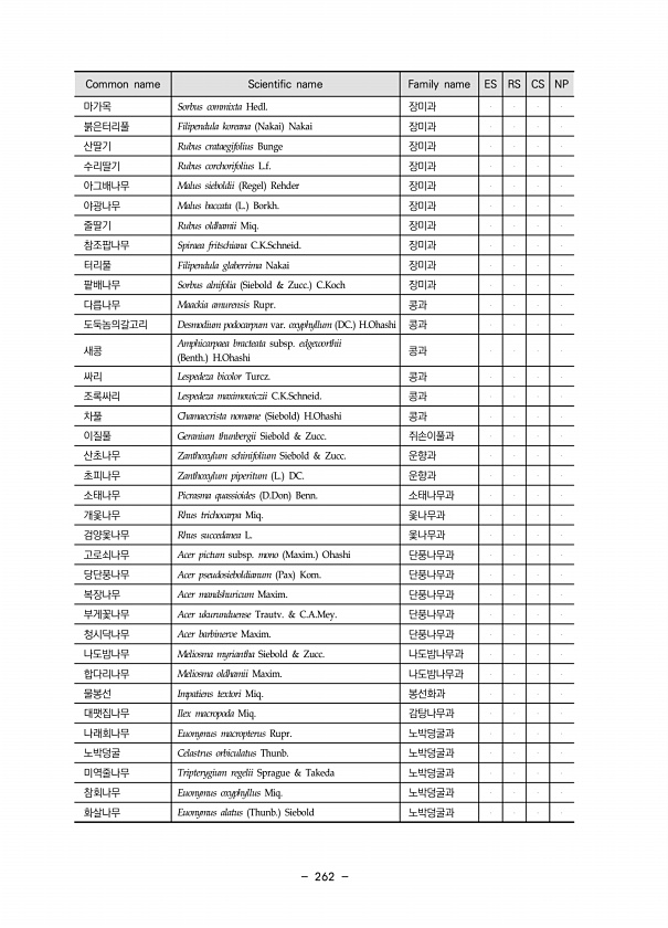 262 Common name Scientific name Family name ES RS CS NP 마가목 Sorbus commixta Hedl. 장미과 붉은터리풀 Filipendula koreana Nakai Nakai 장미과 산딸기 Rubus crataegifolius Bunge 장미과 수리딸기 Rubus corchorifolius L.f. 장미과 아그배나무 Malus sieboldii Regel Rehder 장미과 야광나무 Malus baccata L. Borkh. 장미과 줄딸기 Rubus oldhamii Miq. 장미과 참조팝나무 Spiraea fritschiana C.K.Schneid. 장미과 터리풀 Filipendula glaberrima Nakai 장미과 팥배나무 Sorbus alnifolia ...