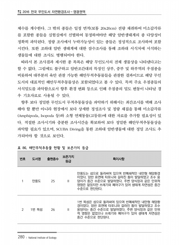 2016 전국 무인도서 자연환경조사 영광권역 280 ? National Institute of Ecology 번호 도서명 출현종수 보존가치 등급 특이사항 1 만풍도 25 II 만풍도는 섬으로 둘러싸여 있으며 반폐쇄적인 내만형 해양환경 이었다. 암반 표면에 타포니와 갈라진 틈이 발달하였고 조수 웅 덩이가 중간 수준으로 발달하였다. 주변 양식장과 같은 인위적 영향은 없었지만 쓰레기와 폐어구가 있어 생태계 자연성은 중간 수준으로 판단된다. 2 1번 목섬 26 II 1번 목섬은 섬으로 둘러싸여 있으며 반폐쇄적인 내만형 해양환 경이었다. 암반 표면에 타포니와 갈라진 틈이 발달하였고 조수 웅덩이는 중간 수준으로 발달하였다. 주변 양식장과 같은 인위 적 영향은 없었으나 쓰레기와 폐어구가 있어 생태계 자연성은 중간 수준으...