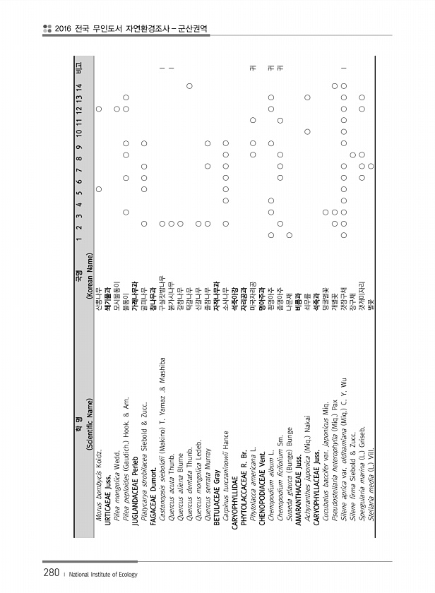280 ? National Institute of Ecology 학 명 Scientific Name 국명 Korean Name 1 2 3 4 5 6 7 8 9 10 11 12 13 14 비고 Morus bombycis Koidz. 산뽕나무 ○ ○ URTICAEAE Juss. 쐐기풀과 Pilea mongolica Wedd. 모시물통이 ○ Pilea peploides Gaudich. Hook. & Arn. 물통이 ○ ○ ○ ○ ○ ○ JUGLANDACEAE Perleb 가래나무과 Platycarya strobilacea Siebold & Zucc. 굴피나무 ○ ○ ○ ○ ○ FAGACEAE Dumort. 참나무과 Castanopsis sieboldii Makino T. Yamaz .& Mashiba 구실잣밤나무...