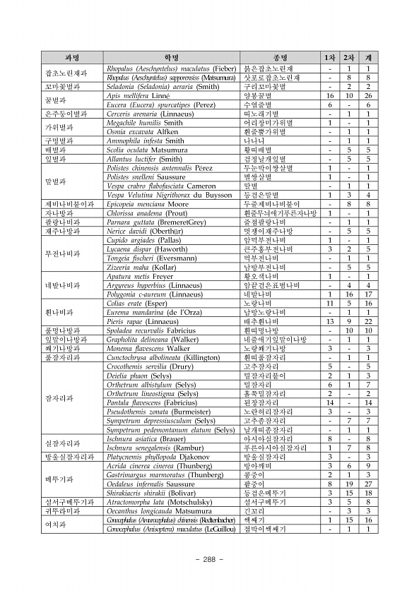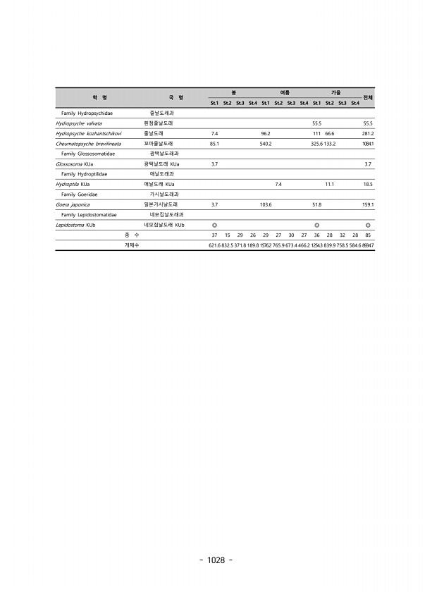 1028 학 명 국 명 봄 여름 가을 전체 St.1 St.2 St.3 St.4 St.1 St.2 St.3 St.4 St.1 St.2 St.3 St.4 Family Hydropsychidae 줄날도래과 Hydropsyche valvata 흰점줄날도래 55.5 55.5 Hydropsyche kozhantschikovi 줄날도래 7.4 96.2 111 66.6 281.2 Cheumatopsyche brevilineata 꼬마줄날도래 85.1 540.2 325.6 133.2 1084.1 Family Glossosomatidae 광택날도래과 Glossosoma KUa 광택날도래 KUa 3.7 3.7 Family Hydroptilidae 애날도래과 Hydroptila KUa 애날도래 KUa 7.4 11.1 18.5 F...