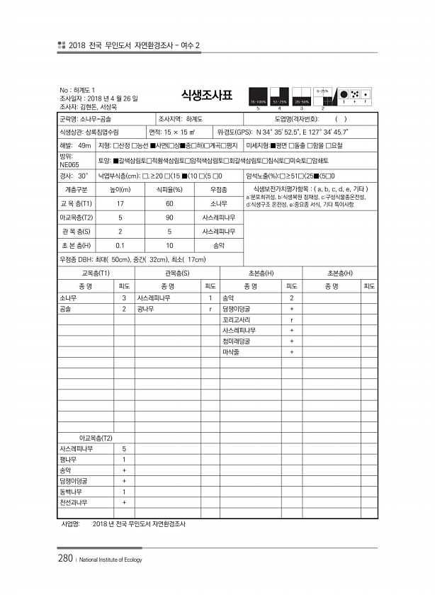 2018 전국 무인도서 자연환경조사 여수 2 280 ? National Institute of Ecology No 하계도 1 조사일자 2018 년 4 월 26 일 조사자김현돈, 서상욱 식생조사표 군락명소나무-곰솔 조사지역하계도 도엽명 격자번호 식생상관상록침엽수림 면적15 × 15 ㎡ 위?경도 GPS N 34° 3552.5, E 127° 3445.7해발49m 지형□산정 □능선 ■사면 □상■중□하 □계곡□평지 미세지형■평면 □돌출 □함몰 □요철 방위NE065 토양■갈색삼림토□적황색삼림토□암적색삼림토□회갈색삼림토□침식토□미숙토□암쇄토 경사30° 낙엽부식층 cm □.≥20 □ 15 ■ 10 □ 5 □0 암석노출 % □≥51□ 25■ 5□0 계층구분 높이 m 식피율 % 우점종 식생보전가치평가항목 a, b, c, d,...