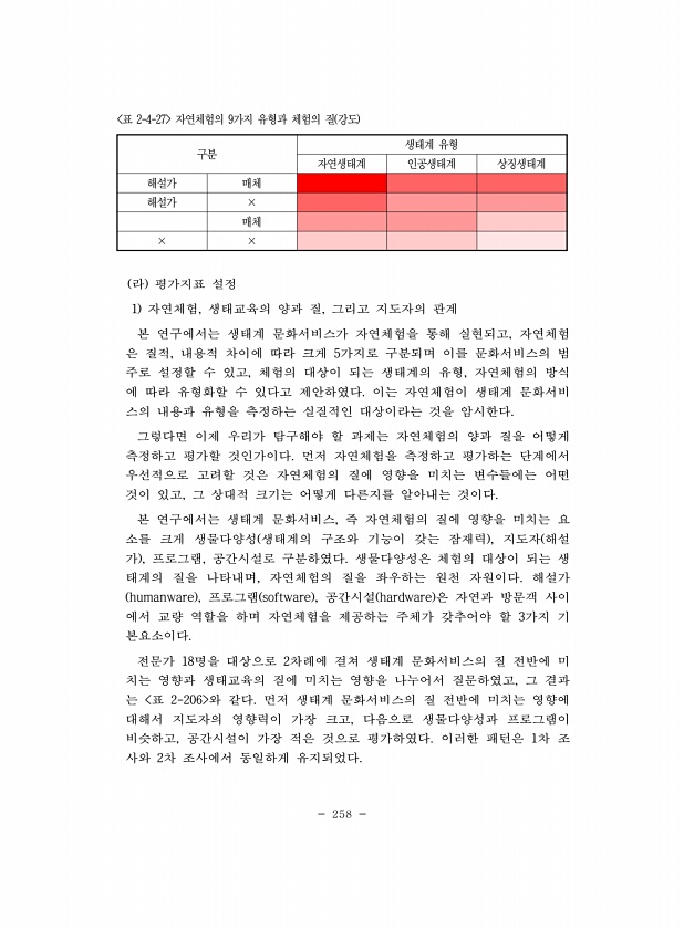 258 구분 생태계 유형 자연생태계 인공생태계 상징생태계 해설가 매체 해설가 × 매체 × × 표 2-4-27 자연체험의 9가지 유형과 체험의 질 강도 라 평가지표 설정 1 자연체험, 생태교육의 양과 질, 그리고 지도자의 관계 본 연구에서는 생태계 문화서비스가 자연체험을 통해 실현되고, 자연체험 은 질적, 내용적 차이에 따라 크게 5가지로 구분되며 이를 문화서비스의 범 주로 설정할 수 있고, 체험의 대상이 되는 생태계의 유형, 자연체험의 방식 에 따라 유형화할 수 있다고 제안하였다. 이는 자연체험이 생태계 문화서비 스의 내용과 유형을 측정하는 실질적인 대상이라는 것을 암시한다. 그렇다면 이제 우리가 탐구해야 할 과제는 자연체험의 양과 질을 어떻게 측정하고 평가할 것인가이다. 먼저 자연체험을 측정하고 평가하는 ...