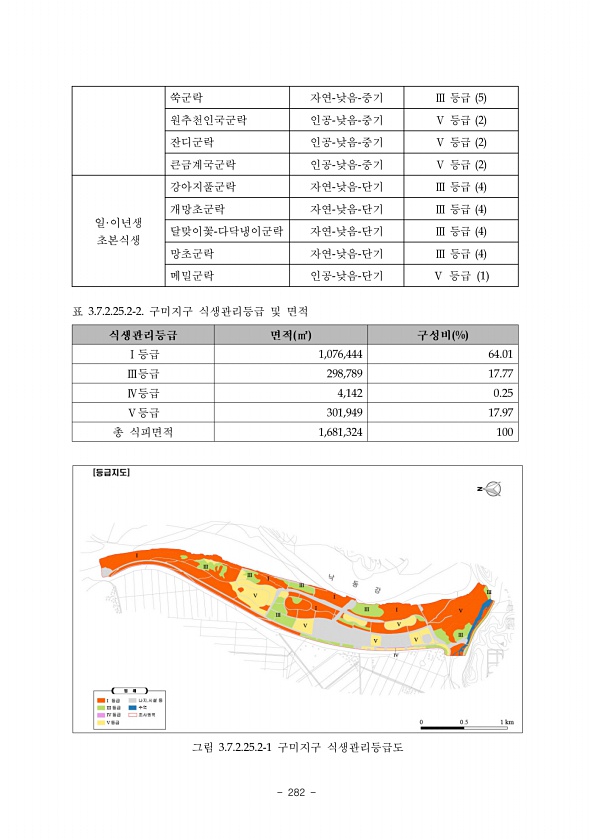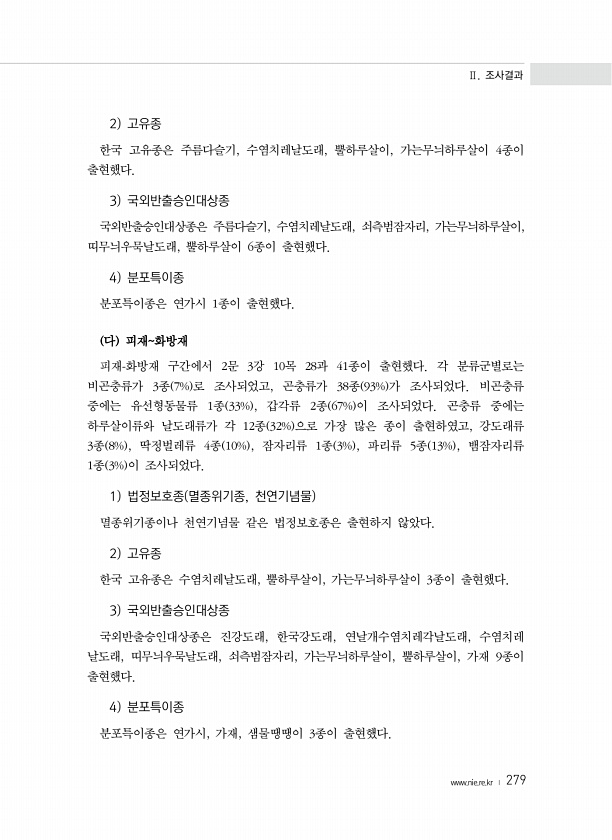 Ⅱ. 조사결과 www.nie.re.kr ? 279 2 고유종 한국 고유종은 주름다슬기, 수염치레날도래, 뿔하루살이, 가는무늬하루살이 4종이 출현했다. 3 국외반출승인대상종 국외반출승인대상종은 주름다슬기, 수염치레날도래, 쇠측범잠자리, 가는무늬하루살이, 띠무늬우묵날도래, 뿔하루살이 6종이 출현했다. 4 분포특이종 분포특이종은 연가시 1종이 출현했다. 다 피재화방재 피재-화방재 구간에서 2문 3강 10목 28과 41종이 출현했다. 각 분류군별로는 비곤충류가 3종 7% 로 조사되었고, 곤충류가 38종 93% 가 조사되었다. 비곤충류 중에는 유선형동물류 1종 33% , 갑각류 2종 67% 이 조사되었다. 곤충류 중에는 하루살이류와 날도래류가 각 12종 32% 으로 가장 많은 종이 출현하였고, 강도래류 3종 8% ,...