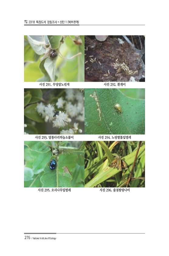 2018 특정도서 정밀조사 신안 1 북부권역 276 ? National Institute of Ecology 사진 291. 무당알노린재 사진 292. 흰개미 사진 293. 알통다리하늘소붙이 사진 294. 노랑발톱잎벌레 사진 295. 오리나무잎벌레 사진 296.줄점팔랑나비