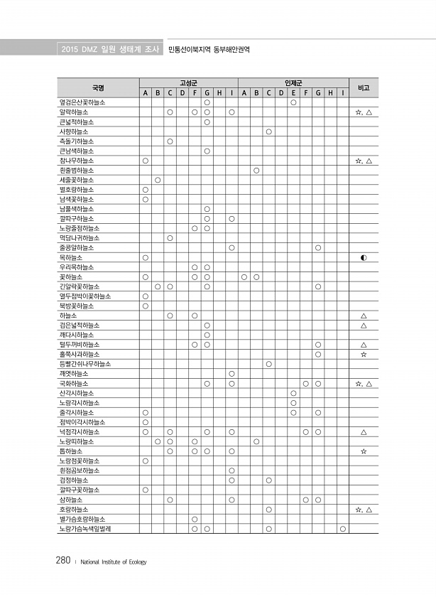 2015 DMZ 일원 생태계 조사 민통선이북지역 동부해안권역 280 ? National Institute of Ecology 국명 고성군 인제군 비고 A B C D F G H I A B C D E F G H I 옆검은산꽃하늘소 ○ ○ 알락하늘소 ○ ○ ○ ○ ☆, △ 큰넓적하늘소 ○ 사향하늘소 ○ 측돌기하늘소 ○ 큰남색하늘소 ○ 참나무하늘소 ○ ☆, △ 흰줄범하늘소 ○ 세줄꽃하늘소 ○ 벌호랑하늘소 ○ 남색꽃하늘소 ○ 남풀색하늘소 ○ 깔따구하늘소 ○ ○ 노랑줄점하늘소 ○ ○ 먹당나귀하늘소 ○ 줄콩알하늘소 ○ ○ 목하늘소 ○ ◐ 우리목하늘소 ○ ○ 꽃하늘소 ○ ○ ○ ○ ○ 긴알락꽃하늘소 ○ ○ ○ ○ 열두점박이꽃하늘소 ○ 북방꽃하늘소 ○ 하늘소 ○ ○ △ 검은넓적하늘소 ○ △ 깨다시하늘소 ○ 털두꺼비하늘소 ○...