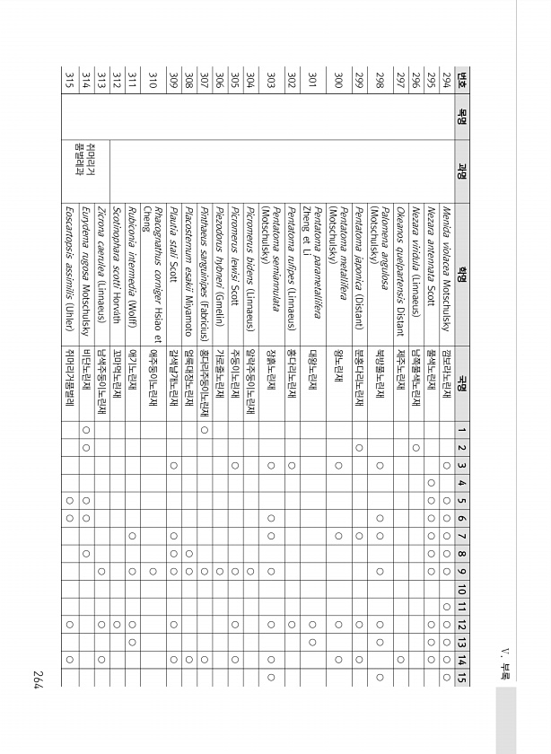Ⅴ. 부록 264 번호 목명 과명 학명 국명 1 2 3 4 5 6 7 8 9 10 11 12 13 14 15 294 Menida violacea Motschulsky 깜보라노린재 ○ ○ ○ ○ ○ ○ ○ ○ ○ ○ ○ 295 Nezara antennata Scott 풀색노린재 ○ ○ ○ ○ ○ ○ ○ ○ ○ 296 Nezara viridula Linnaeus 남쪽풀색노린재 ○ 297 Okeanos quelpartensis Distant 제주노린재 ○ 298 Palomena angulosa Motschulsky 북방풀노린재 ○ ○ ○ ○ ○ ○ ○ 299 Pentatoma japonica Distant 분홍다리노린재 ○ ○ ○ ○ 300 Pentatoma metallifera Motschulsky 왕노린재 ○...