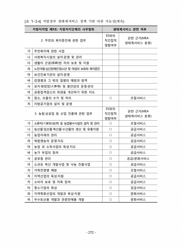 지방자치법 제9조지방자지단체의 사무범위 생태계서비스 관련 여부 2. 주민의 복지증진에 관한 업무 ES와의 직간접적 영향여부 관련 근거 MEA 생태계서비스 분류 가 주민복지에 관한 사업 나 사회복지시설의 설치·운영 및 관리 다 생활이 곤궁 困窮 한 자의 보호 및 지원 라 노인·아동·심신장애인·청소년 및 여성의 보호와 복지증진 마 보건진료기관의 설치·운영 바 감염병과 그 밖의 질병의 예방과 방역 사 묘지·화장장 火葬場 및 봉안당의 운영·관리 아 공중접객업소의 위생을 개선하기 위한 지도 자 청소, 오물의 수거 및 처리 ? 조절서비스 차 지방공기업의 설치 및 운영 3. 농림·상공업 등 산업 진흥에 관한 업무 ES와의 직간접적 영향여부 관련 근거 MEA 생태계서비스 분류 가 소류지 小溜池 ·보 洑 등 농업용수시설의 ...