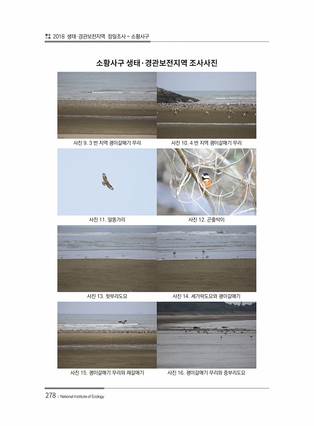 2018 생태·경관보전지역 정밀조사 소황사구 278 ? National Institute of Ecology 사진 9. 3 번 지역 괭이갈매기 무리 사진 10. 4 번 지역 괭이갈매기 무리 사진 11. 말똥가리 사진 12. 곤줄박이 사진 13. 뒷부리도요 사진 14. 세가락도요와 괭이갈매기 사진 15. 괭이갈매기 무리와 재갈매기 사진 16. 괭이갈매기 무리와 중부리도요