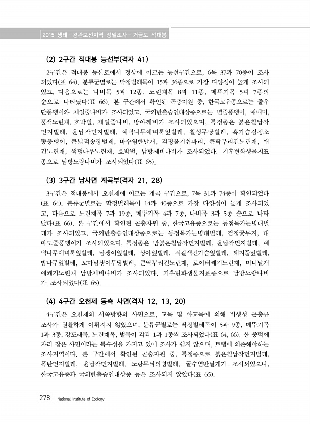 2015 생태·경관보전지역 정밀조사 거금도 적대봉 278 ? National Institute of Ecology 2 2구간 적대봉 능선부 격자 41 2구간은 적대봉 등산로에서 정상에 이르는 능선구간으로, 6목 37과 70종이 조사 되었다 표 64 분류군별로는 딱정벌레목이 15과 36종으로 가장 다양성이 높게 조사되 었고, 다음으로는 나비목 5과 12종, 노린재목 8과 11종, 메뚜기목 5과 7종의 순으로 나타났다 표 66 본 구간에서 확인된 곤충자원 중, 한국고유종으로는 줄우 단풍뎅이와 제일줄나비가 조사되었고, 국외반출승인대상종으로는 별줄풍뎅이, 애매미, 풀색노린재, 호박벌, 제일줄나비, 방아깨비가 조사되었으며, 특정종은 붉은칠납작 먼지벌레, 윤납작먼지벌레, 예덕나무애벼룩잎벌레, 칠성무당벌레, 혹가슴검정소...