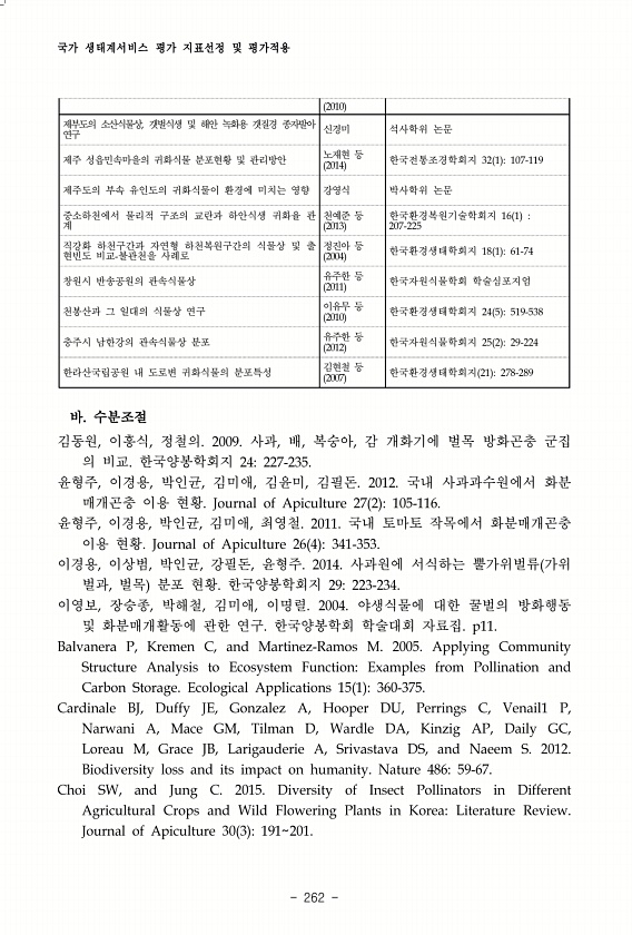 국가 생태계서비스 평가 지표선정 및 평가적용 262 바. 수분조절 김동원, 이흥식, 정철의. 2009. 사과, 배, 복숭아, 감 개화기에 벌목 방화곤충 군집 의 비교. 한국양봉학회지 24227-235. 윤형주, 이경용, 박인균, 김미애, 김윤미, 김필돈. 2012. 국내 사과과수원에서 화분 매개곤충 이용 현황. Journal of Apiculture 27 2 105-116. 윤형주, 이경용, 박인균, 김미애, 최영철. 2011. 국내 토마토 작목에서 화분매개곤충 이용 현황. Journal of Apiculture 26 4 341-353. 이경용, 이상범, 박인균, 강필돈, 윤형주. 2014. 사과원에 서식하는 뿔가위벌류 가위 벌과, 벌목 분포 현황. 한국양봉학회지 29223-234. 이영보, 장승종, 박해철...