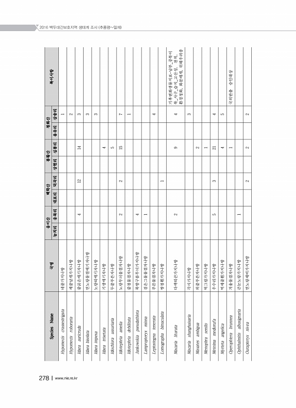 2016 백두대간보호지역 생태계 조사 추풍령밀재 278Ⅰwww.nie.re.kr Species Name 국명 웅이산 백학산 봉황산 청화산 특이사항 능치리 웅북리 대포리 덕곡리 상현리 심봉리 용유리 삼송리 Hypomecis crassestrigata 네줄가지나방 1 Hypomecis roboraria 세줄날개가지나방 2 Idaea auricruda 줄굵은애기자나방 4 12 14 3 Idaea biselata 연노랑물결애기자나방 3 Idaea impexa 노랑띠애기자나방 3 Idaea trisetata 기생애기자나방 4 Idiochlora ussuriaria 두줄푸른자나방 5 Idiotephria amelia 노랑무늬물결자나방 2 2 15 7 Idiotephria debilitata 줄점물결자나방 1 Janko...