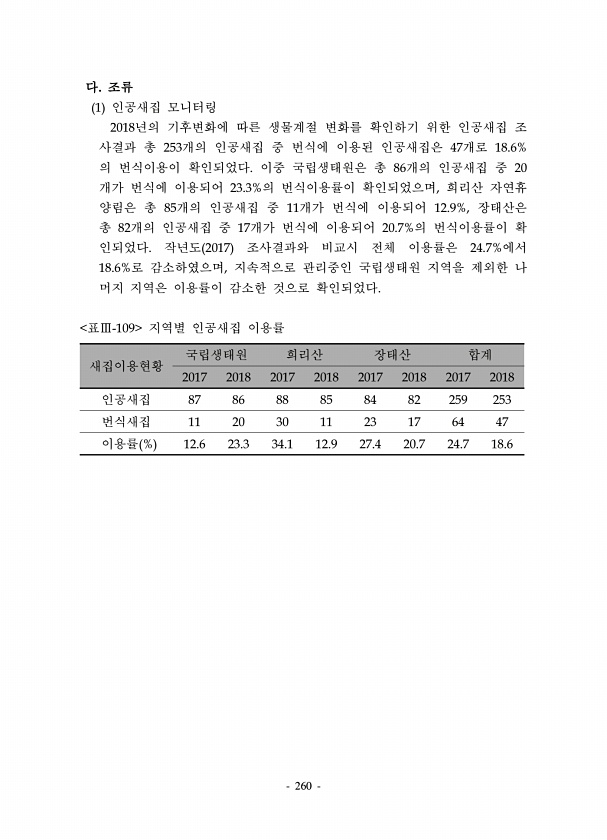 260 다. 조류 1 인공새집 모니터링 2018년의 기후변화에 따른 생물계절 변화를 확인하기 위한 인공새집 조 사결과 총 253개의 인공새집 중 번식에 이용된 인공새집은 47개로 18.6% 의 번식이용이 확인되었다. 이중 국립생태원은 총 86개의 인공새집 중 20 개가 번식에 이용되어 23.3%의 번식이용률이 확인되었으며, 희리산 자연휴 양림은 총 85개의 인공새집 중 11개가 번식에 이용되어 12.9%, 장태산은 총 82개의 인공새집 중 17개가 번식에 이용되어 20.7%의 번식이용률이 확 인되었다. 작년도 2017 조사결과와 비교시 전체 이용률은 24.7%에서 18.6%로 감소하였으며, 지속적으로 관리중인 국립생태원 지역을 제외한 나 머지 지역은 이용률이 감소한 것으로 확인되었다. 새집이용현황 국립생태원...