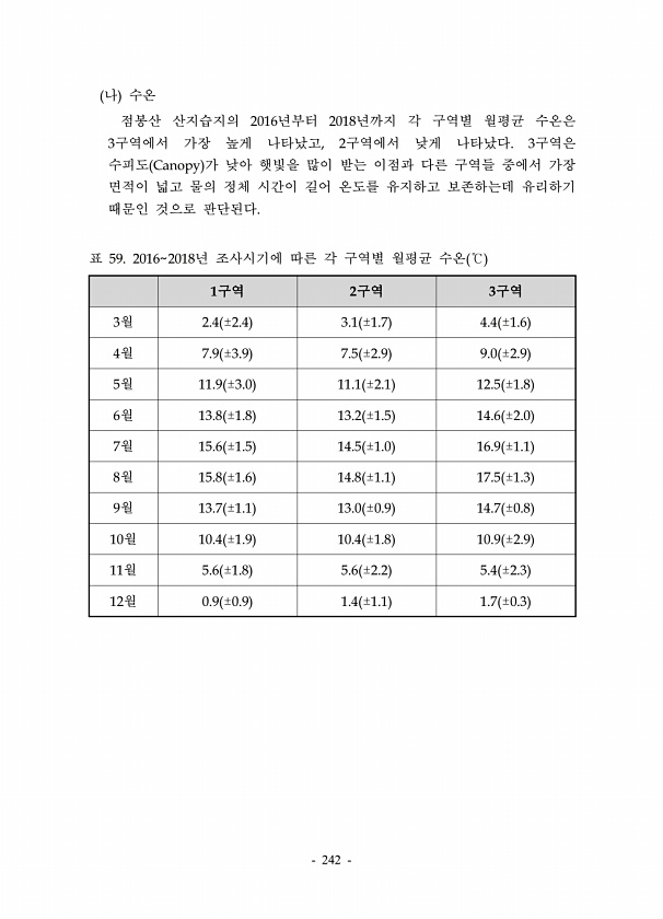 242 나 수온 점봉산 산지습지의 2016년부터 2018년까지 각 구역별 월평균 수온은 3구역에서 가장 높게 나타났고, 2구역에서 낮게 나타났다. 3구역은 수피도 Canopy 가 낮아 햇빛을 많이 받는 이점과 다른 구역들 중에서 가장 면적이 넓고 물의 정체 시간이 길어 온도를 유지하고 보존하는데 유리하기 때문인 것으로 판단된다. 1구역 2구역 3구역 3월 2.4 ±2.4 3.1 ±1.7 4.4 ±1.6 4월 7.9 ±3.9 7.5 ±2.9 9.0 ±2.9 5월 11.9 ±3.0 11.1 ±2.1 12.5 ±1.8 6월 13.8 ±1.8 13.2 ±1.5 14.6 ±2.0 7월 15.6 ±1.5 14.5 ±1.0 16.9 ±1.1 8월 15.8 ±1.6 14.8 ±1.1 17.5 ±1.3 9월 13.7 ±1....