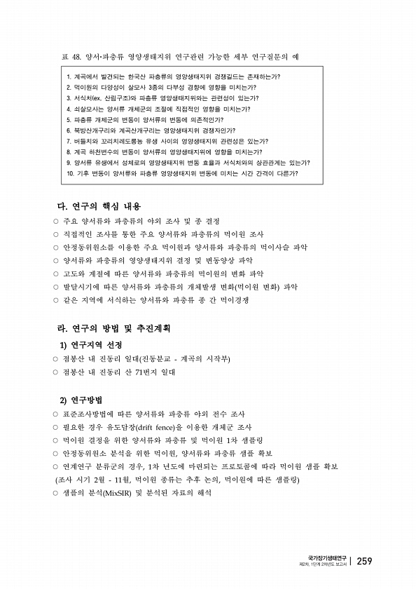 1. 계곡에서 발견되는 한국산 파충류의 영양생태지위 경쟁길드는 존재하는가? 2. 먹이원의 다양성이 살모사 3종의 다부성 경향에 영향을 미치는가? 3. 서식처 ex, 산림구조 와 파충류 영양생태지위와는 관련성이 있는가? 4. 쇠살모사는 양서류 개체군의 조절에 직접적인 영향을 미치는가? 5. 파충류 개체군의 변동이 양서류의 변동에 의존적인가? 6. 북방산개구리와 계곡산개구리는 영양생태지위 경쟁자인가? 7. 버들치와 꼬리치레도롱뇽 유생 사이의 영양생태지위 관련성은 있는가? 8. 계곡 하천변수의 변동이 양서류의 영양생태지위에 영향을 미치는가? 9. 양서류 유생에서 성체로의 영양생태지위 변동 효율과 서식처와의 상관관계는 있는가? 10. 기후 변동이 양서류와 파충류 영양생태지위 변동에 미치는 시간 간격이 다른가? 표 ...
