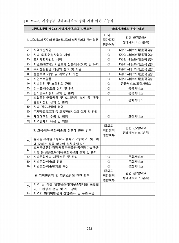 지방자치법 제9조지방자지단체의 사무범위 생태계서비스 관련 여부 4. 지역개발과 주민의 생활환경시설의 설치·관리에 관한 업무 ES와의 직간접적 영향여부 관련 근거 MEA 생태계서비스 분류 가 지역개발사업 ? 다수의 서비스와 직간접적 영향 나 지방 토목·건설사업의 시행 ? 다수의 서비스와 직간접적 영향 다 도시계획사업의 시행 ? 다수의 서비스와 직간접적 영향 라 지방도 地方道 , 시군도의 신설·개수 改修 및 유지 ? 다수의 서비스와 직간접적 영향 마 주거생활환경 개선의 장려 및 지원 다수의 서비스와 직간접적 영향 바 농촌주택 개량 및 취락구조 개선 ? 다수의 서비스와 직간접적 영향 사 자연보호활동 ? 다수의 서비스와 직간접적 영향 아 지방하천 및 소하천의 관리 ? 공급서비스/조절서비스 자 상수도·하수도의 설치 ...