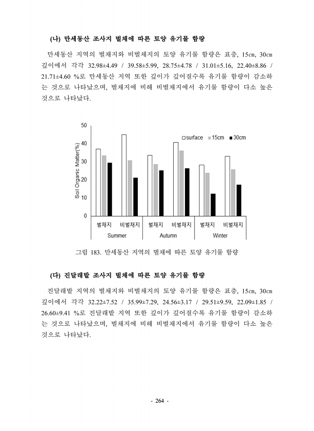 242 나 수온 점봉산 산지습지의 2016년부터 2018년까지 각 구역별 월평균 수온은 3구역에서 가장 높게 나타났고, 2구역에서 낮게 나타났다. 3구역은 수피도 Canopy 가 낮아 햇빛을 많이 받는 이점과 다른 구역들 중에서 가장 면적이 넓고 물의 정체 시간이 길어 온도를 유지하고 보존하는데 유리하기 때문인 것으로 판단된다. 1구역 2구역 3구역 3월 2.4 ±2.4 3.1 ±1.7 4.4 ±1.6 4월 7.9 ±3.9 7.5 ±2.9 9.0 ±2.9 5월 11.9 ±3.0 11.1 ±2.1 12.5 ±1.8 6월 13.8 ±1.8 13.2 ±1.5 14.6 ±2.0 7월 15.6 ±1.5 14.5 ±1.0 16.9 ±1.1 8월 15.8 ±1.6 14.8 ±1.1 17.5 ±1.3 9월 13.7 ±1....