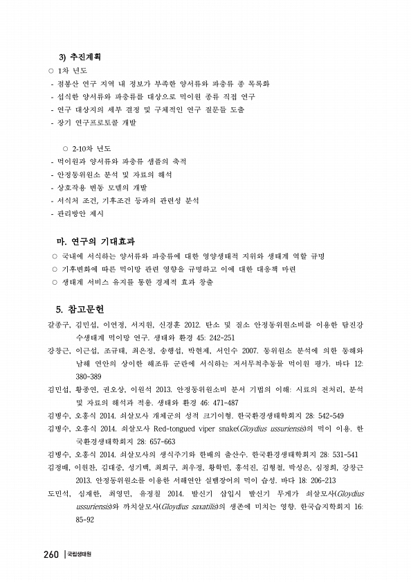 추진계획 차 년도 점봉산 연구 지역 내 정보가 부족한 양서류와 파충류 종 목록화 섭식한 양서류와 파충류를 대상으로 먹이원 종류 직접 연구 연구 대상지의 세부 결정 및 구체적인 연구 질문들 도출 장기 연구프로토콜 개발 차 년도 먹이원과 양서류와 파충류 샘플의 축적 안정동위원소 분석 및 자료의 해석 상호작용 변동 모델의 개발 서식처 조건 기후조건 등과의 관련성 분석 관리방안 제시 마 연구의 기대효과 국내에 서식하는 양서류와 파충류에 대한 영양생태적 지위와 생태계 역할 규명 기후변화에 따른 먹이망 관련 영향을 규명하고 이에 대한 대응책 마련 생태계 서비스 유지를 통한 경제적 효과 창출 참고문헌 갈종구, 김민섭, 이연정, 서지원, 신경훈 2012. 탄소 및 질소 안정동위원소비를 이용한 탐진강 수생태계 먹이망 연구....