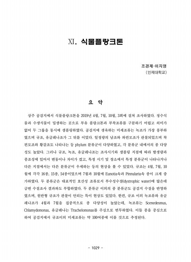 1029 ?. 식물플랑크톤 조경제·이지영 인제대학교 요 약 상주 공검지에서 식물플랑크톤을 2019년 4월, 7월, 10월, 3회에 걸쳐 조사하였다. 정수식 물과 수생식물이 밀생하는 곳으로 부유 플랑크톤과 부착조류를 구분하기 어렵고 의미가 없어 두 그룹을 동시에 샘플링하였다. 공검지에 생육하는 미세조류는 녹조가 가장 풍부하 였으며 규조, 유글레나조가 그 뒤를 이었다. 일정량의 남조와 와편모조가 관찰되었으며 착 편모조와 황갈조도 나타나는 등 phylum 분류군이 다양하였고, 각 분류군 내에서의 종 다양 성도 높았다. 그러나 규조, 녹조, 유글레나조는 조사시기와 샘플링 지점에 따라 발생량과 종조성에 있어서 변동이나 차이가 컸고, 특정 시기 및 장소에서 특정 분류군이 나타나거나 다른 지점에서는 다른 분류군이 우세하...