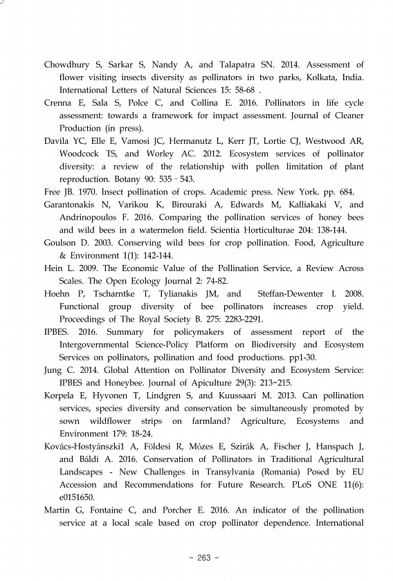 263 Chowdhury S, Sarkar S, Nandy A, and Talapatra SN. 2014. Assessment of flower visiting insects diversity as pollinators in two parks, Kolkata, India. International Letters of Natural Sciences 1558-68 Crenna E, Sala S, Polce C, and Collina E. 2016. Pollinators in life cycle assessmenttowards a framework for impact assessment. Journal of Cleaner Production in press Davila YC, Elle E, Vamosi JC, H...