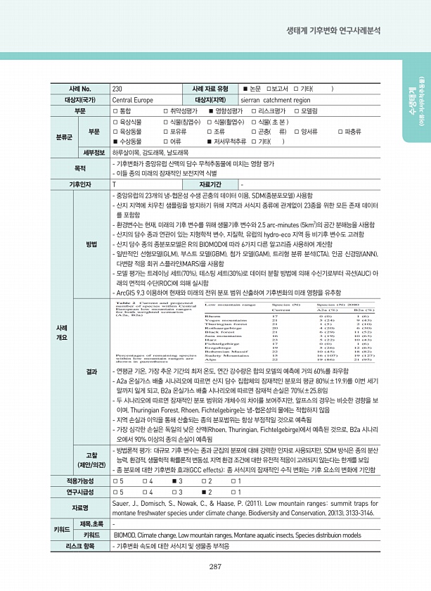 287 생태계 기후변화 연구사례분석 수생태계 어류·저서무척추동물 사례 No. 230 사례 자료 유형 ■ 논문 □보고서 □ 기타 대상지 국가 Central Europe 대상지 지역 sierran catchment region 부문 □ 통합 □ 취약성평가 ■ 영향성평가 □ 리스크평가 □ 모델링 분류군 부문 □ 육상식물 □ 식물 침엽수 □ 식물 활엽수 □ 식물 초 본 □ 육상동물 □ 포유류 □ 조류 □ 곤충 류 □ 양서류 □ 파충류 ■ 수상동물 □ 어류 ■ 저서무척추류 □ 기타 세부정보 하루살이목, 강도래목, 날도래목 목적 기후변화가 중앙유럽 산맥의 담수 무척추동물에 미치는 영향 평가 이들 종의 미래의 잠재적인 보전지역 식별 기후인자 T 자료기간 사례 개요 방법 중앙유럽의 23개의 냉-협온성 수생 곤충의 데이터 ...