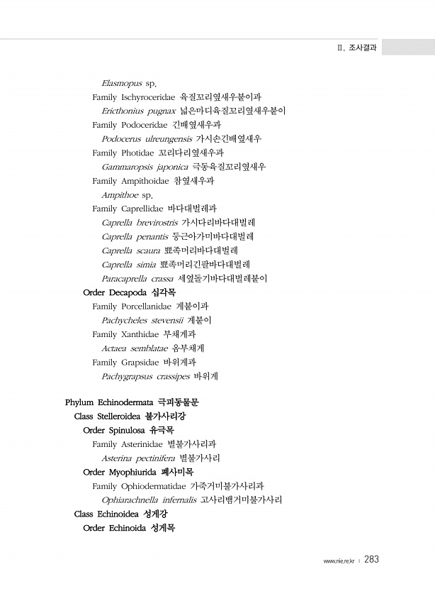 Ⅱ. 조사결과 www.nie.re.kr ? 283 Elasmopus sp. Family Ischyroceridae 육질꼬리옆새우붙이과 Ericthonius pugnax 넓은마디육질꼬리옆새우붙이 Family Podoceridae 긴배옆새우과 Podocerus ulreungensis 가시손긴배옆새우 Family Photidae 꼬리다리옆새우과 Gammaropsis japonica 극동육질꼬리옆새우 Family Ampithoidae 참옆새우과 Ampithoe sp. Family Caprellidae 바다대벌레과 Caprella brevirostris 가시다리바다대벌레 Caprella penantis 둥근아가미바다대벌레 Caprella scaura 뾰족머리바다대벌레 Caprella simia 뾰족머리긴팔바다대벌레 ...